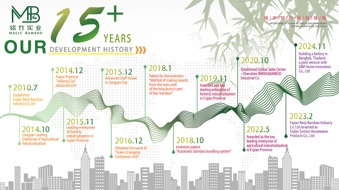Fujian Sunton Household Products Co., Ltd. is the manufacturing factory for MAGICBAMBOO, with over 15 years of experience in bamboo product manufacturing. The company, formerly known as Fujian Renji Bamboo Industry Co., Ltd., was established in July 2010. For 15 years, we have closely collaborated with the community and bamboo farmers, helping them increase their agricultural product income and improve the living conditions of villages and craftsmen. Through continuous exploration and innovation, we have obtained multiple design patents and invention patents.